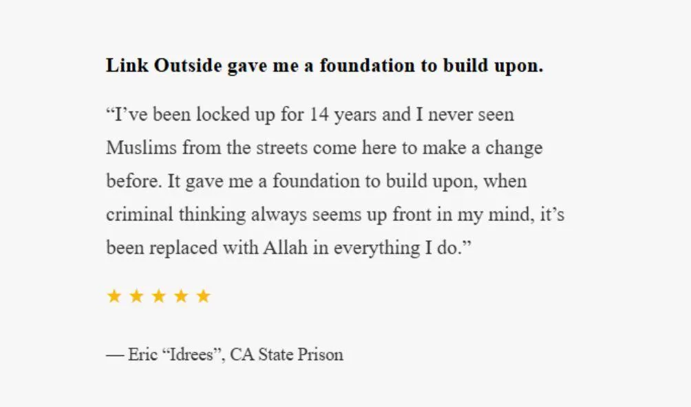 Through Link Outside’s prison outreach, Kareem didn’t just learn Qur’anic teachings—he found the guidance to rebuild his life. Today, his journey is a testament to the power of faith, education, and mentorship. His transformation began with a single connection to the outside world. You can be that connection for another brother or sister this Ramadan.